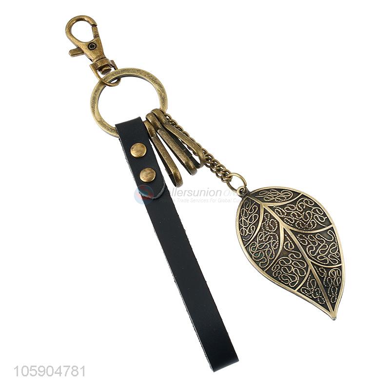 Factory price leather key chain with retro leaf charms