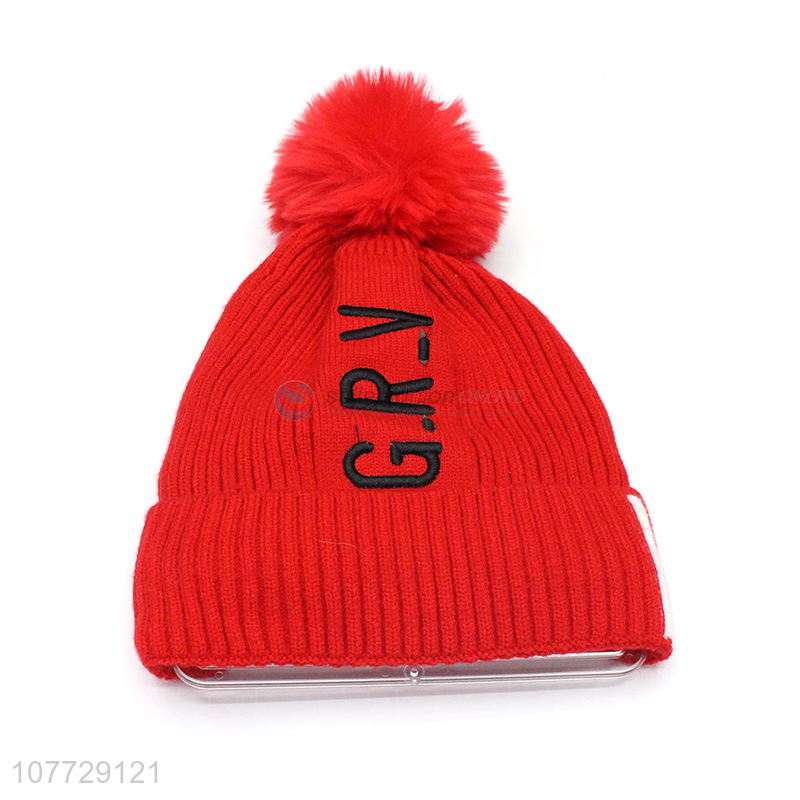 Wholesale women letter embroidery hat ladies winter fleece lined hat with pompom